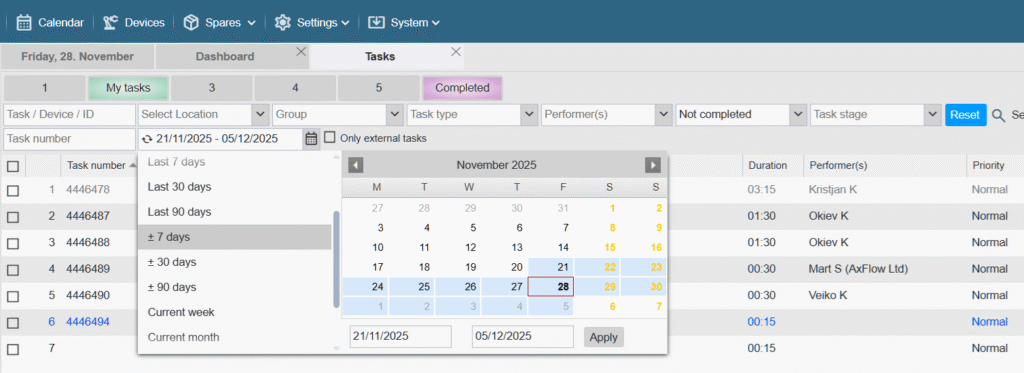 - In Reports > Spare parts > Spare part history and Device/Location‑based history tables, the location filter did not work and always returned an empty page – Fixed