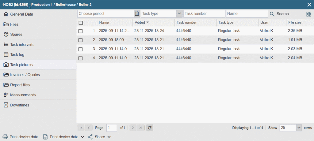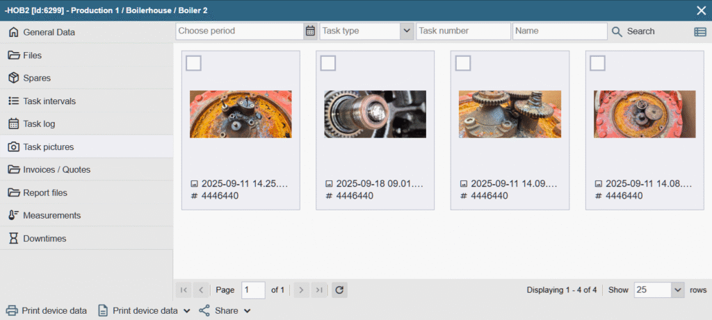 - Added a new tab “Task pictures” to the device card. This tab displays all images attached to work orders, with the option to switch between list view and grid view.
