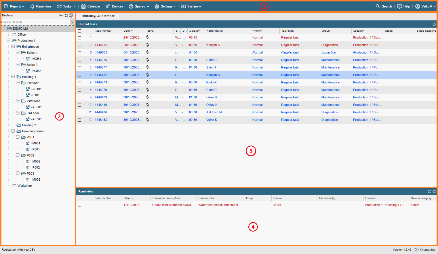 - Work Orders – This window displays the work orders for the current and the following days that need to be completed (overdue work is displayed in red). The range of days displayed can be changed in the settings. The default is 7 days.