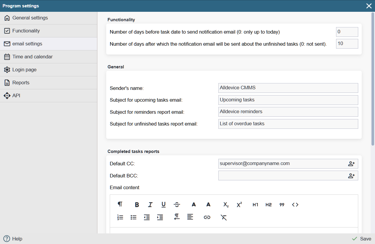 Default CC: Address to which an e-mail copy of the works report is sent by default.