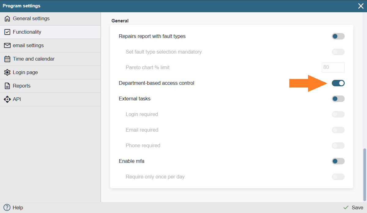 First, you need to make sure that the functionality is activated. Open Settings > Settings > Functionality > General (scroll down) > Department‑based access control. Make sure the functionality is enabled.