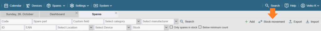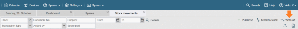 To perform a write-off, click the “Spare Parts” button on the top toolbar, then click the “Stock Movement” button located at the top right of the opened table header…
