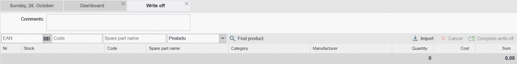 In the opened window, first fill in the comment field. Although it’s not mandatory, it is advisable to leave a comment explaining why the following spare parts are being written off