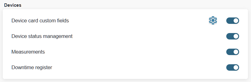 Device card custom fields: the custom fields functionality allows you to create additional fields on the device card for data for which there is no place by default. To activate the function, switch on the “Device card custom fields” fields and then click on the “Save” button in the bottom right corner of the window. Then click on the settings button (sprocket) to create new fields. Read more HERE.