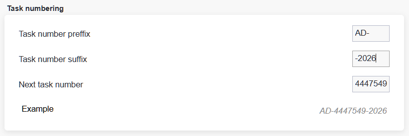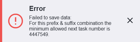 The task number cannot be smaller than the largest existing number already in use with the specified prefix and suffix. If the selected number is smaller, a corresponding error message will be displayed upon saving.