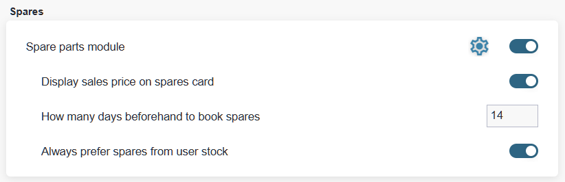 How many days beforehand to book spares: if spare parts are marked on a work order, they will be booked for that work order if there are a given number of days or less left until the work order date. The default setting is 14 days.