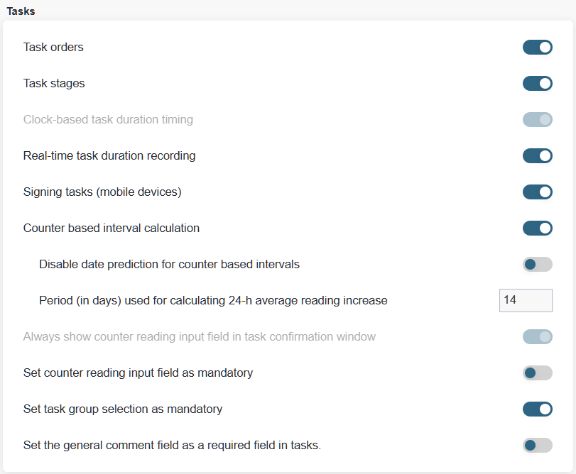 Disable date prediction for counter based intervals: Disables the prediction of the task date based on the device’s counter readings. The task is created only when the counter reading completed.