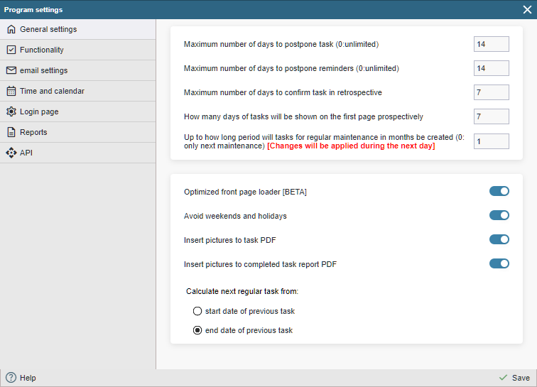 Maximum number of days to confirm task in retrospective: Once the maintenance work has been carried out, it must be marked as completed in the programme. When the work is indicated, the actual date of execution must also be entered. The execution of the work and the entry in the Alldevice programme may not necessarily take place on the same day. The date can also be selected retrospectively. In order to avoid that maintenance work carried out ‘yesterday’ is not marked as having been carried out three months ago, a maximum number of days can be set, how many days backwards it is possible to set the date of execution of the work. The default is 14 days.