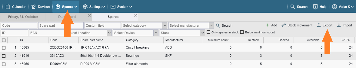 To retrieve the spare parts data export file, click on the “Spare parts” button in the top menu bar. If necessary, set the filters and then click on the “Export” button in the top right corner of the page.