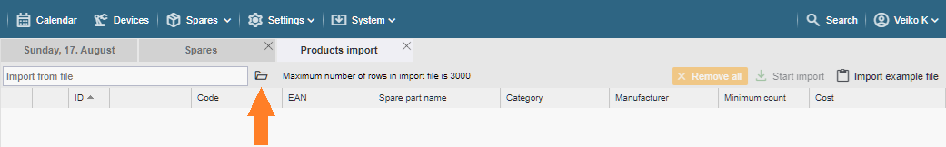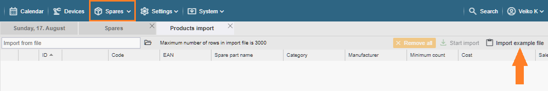 To do this, click on “Spare Parts” in the top menu bar, select “Import” in the right corner of the page that opens, and from there select “Import sample file”.
