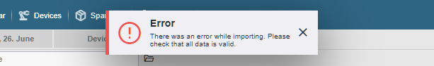 If there are any errors in the data, a red triangle icon will be displayed in front of the corresponding row (all rows with errors will always be displayed at the beginning), and the invalid data field will be marked with a red dotted line (in the example “Category” above). Errors will be displayed if the corresponding manufacturer or category has not been created in the Alldevice database, or if a spelling error has occurred, or if the data is in the wrong format (for example, you are trying to import text into the number field).