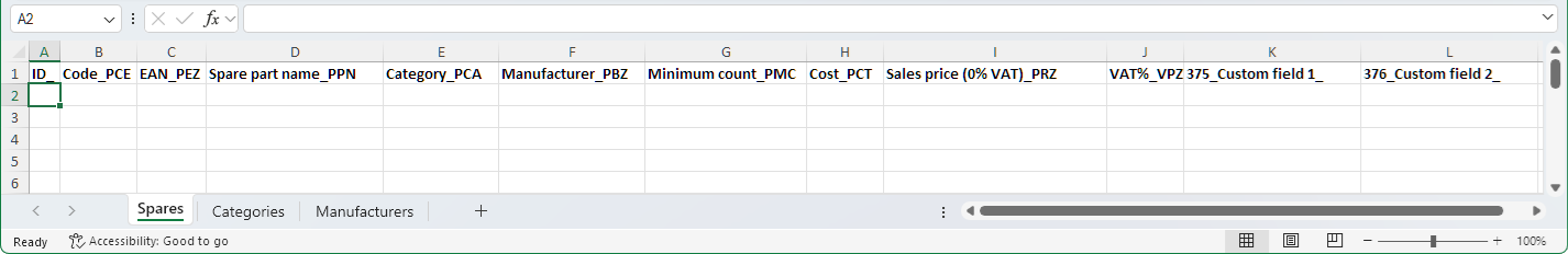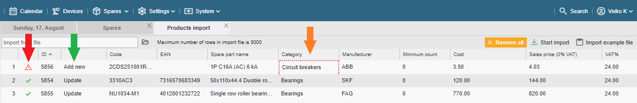 If it is necessary to correct the imported data, export the spare parts, modify the data in this file and import it back into the application. In this case, the ID_ column of the table will also contain the correct database ID numbers, which will tell the application that you want to update the device data and not add new devices. - Do not use formulas in the import file.
