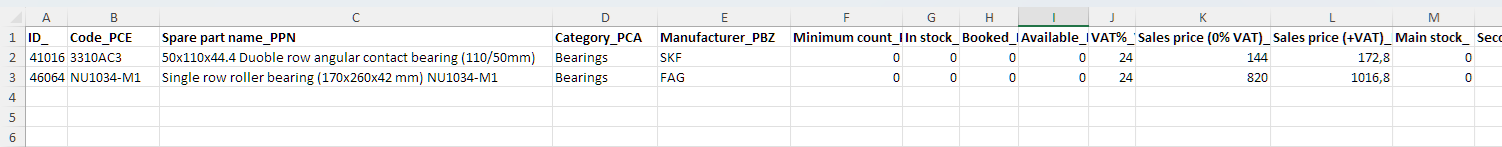 To import new spare parts, you can use the spare parts export file and add the new lines to be added at the end of the file. You can also delete the lines above and fill the same file as described above, but you can also download the sample import file.