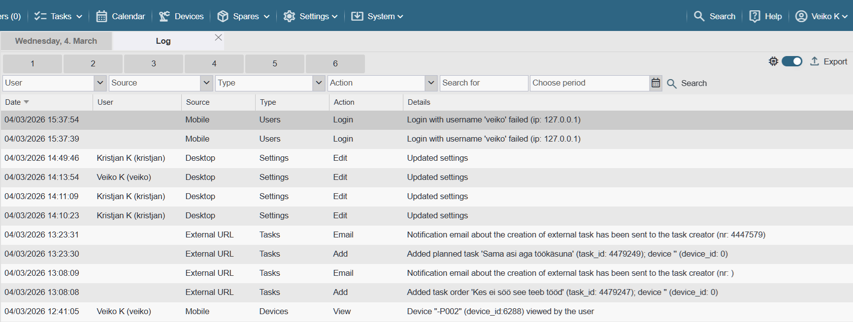 - Details: A more detailed explanation of the log entry. PS! The description of the log entries (additional information) is always in English and is not translated.