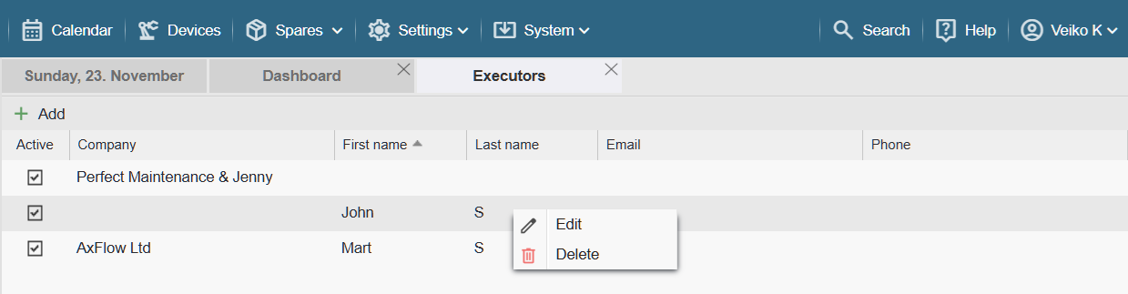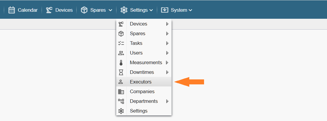 Note! If you do not see the referenced menu links in the Alldevice CMMS application, you lack the necessary permission (privilege) to manage executors.