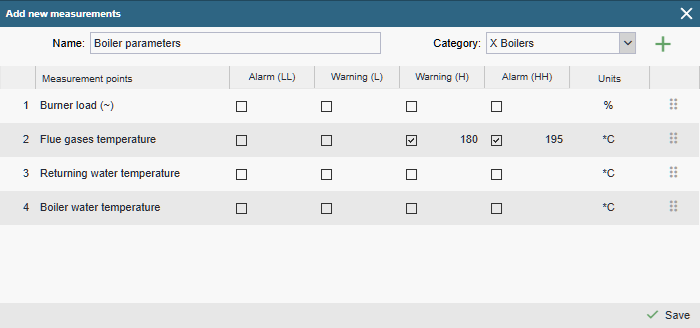 Alarm (LL, HH) and Warning (L, H): Each measurement point can be configured with both low and high warning and alarm thresholds.