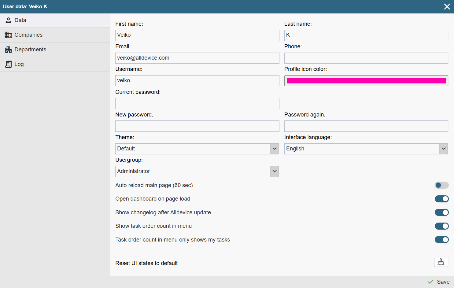 Users (general) | Data | Companies | Departments | Log