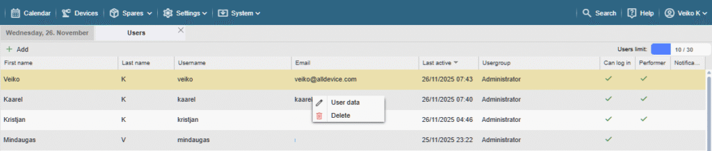 In the Alldevice application, you can create, edit, or delete users through the menu ‘Settings > Users > Users’.