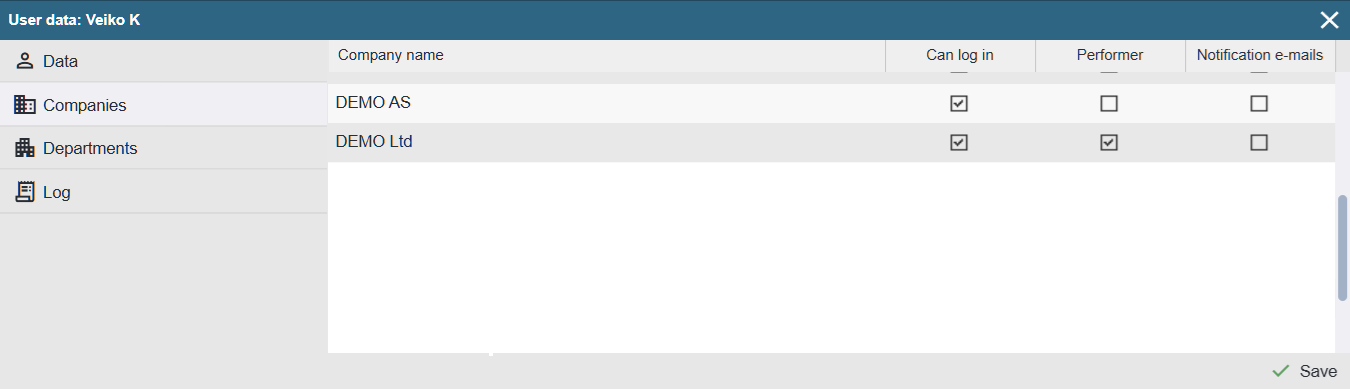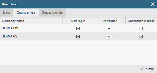 Companies TAB Defines which companies the user can log in to, where they act as a performer, and from which companies they receive emails.