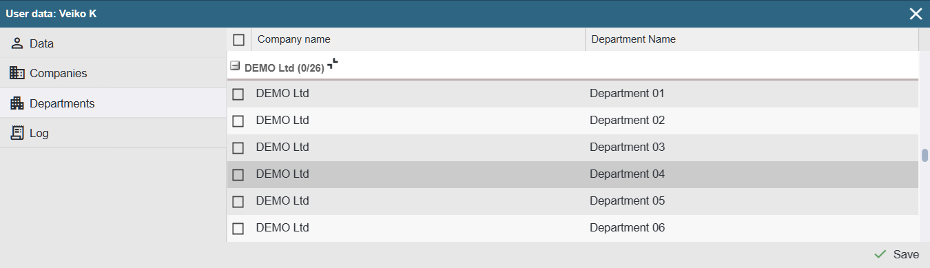 To assign a department, select the checkbox in front of the desired row.