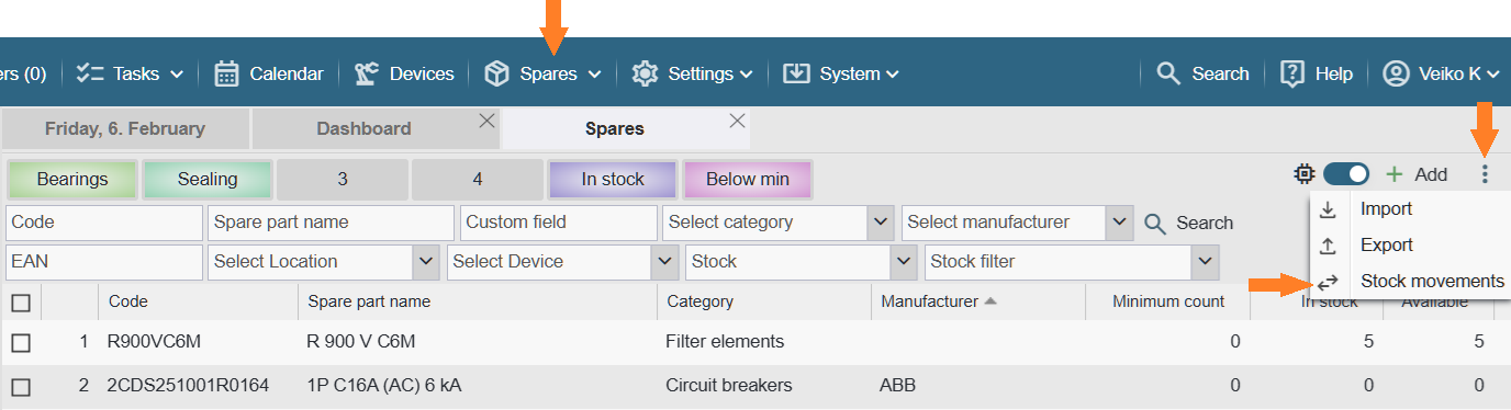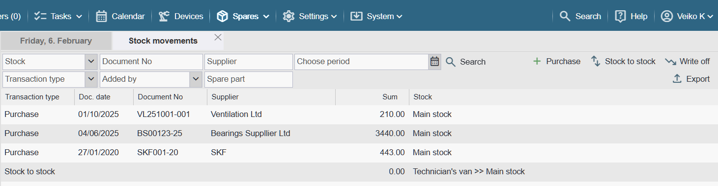 Another way to open the Stock Movements table is to click the “Spare parts” button and then, in the header of the table that opens, click the “Stock movements” button on the right.
