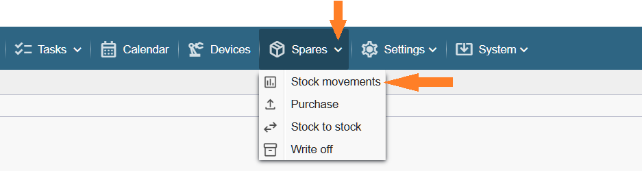 The Stock Movements table can be opened by clicking the small arrow next to the “Spare parts” button in the top bar, which opens the button’s context menu. The table displays all stock movement documents (purchases, stock to stock movements or write‑offs for adjusting spare parts stock outside of work orders)