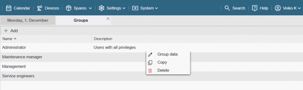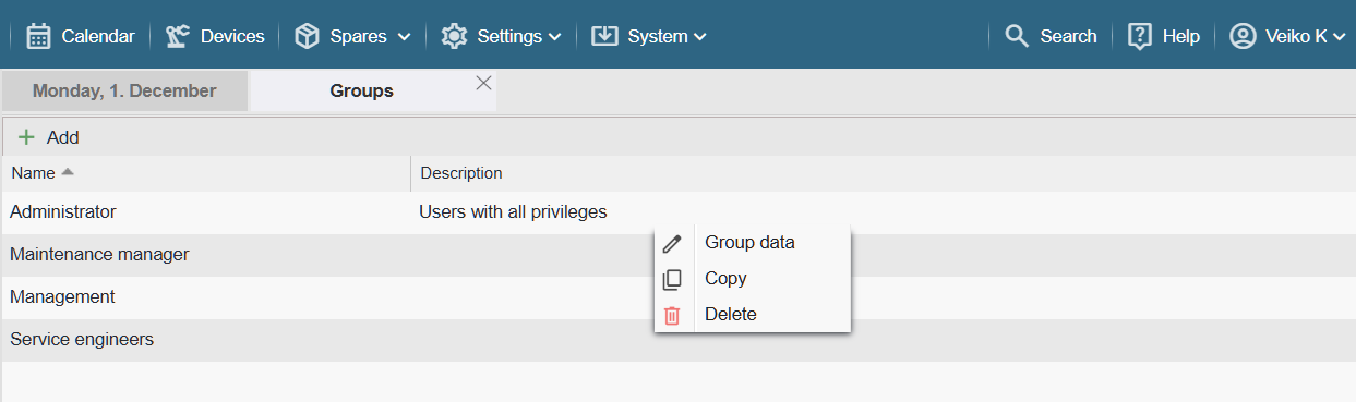 Note! If the referenced menu links are not visible in the Alldevice CMMS application, you do not have the required privilege to manage privilege groups.