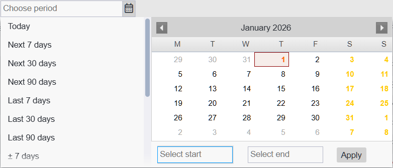 To select a date range, click the desired start date and then the end date. The chosen dates will also appear in the start and end fields below the calendar. The range is applied to the filter instantly, so you don’t need to press “Apply”. If you enter the start or end date manually, then you do need to confirm it by clicking “Apply”.