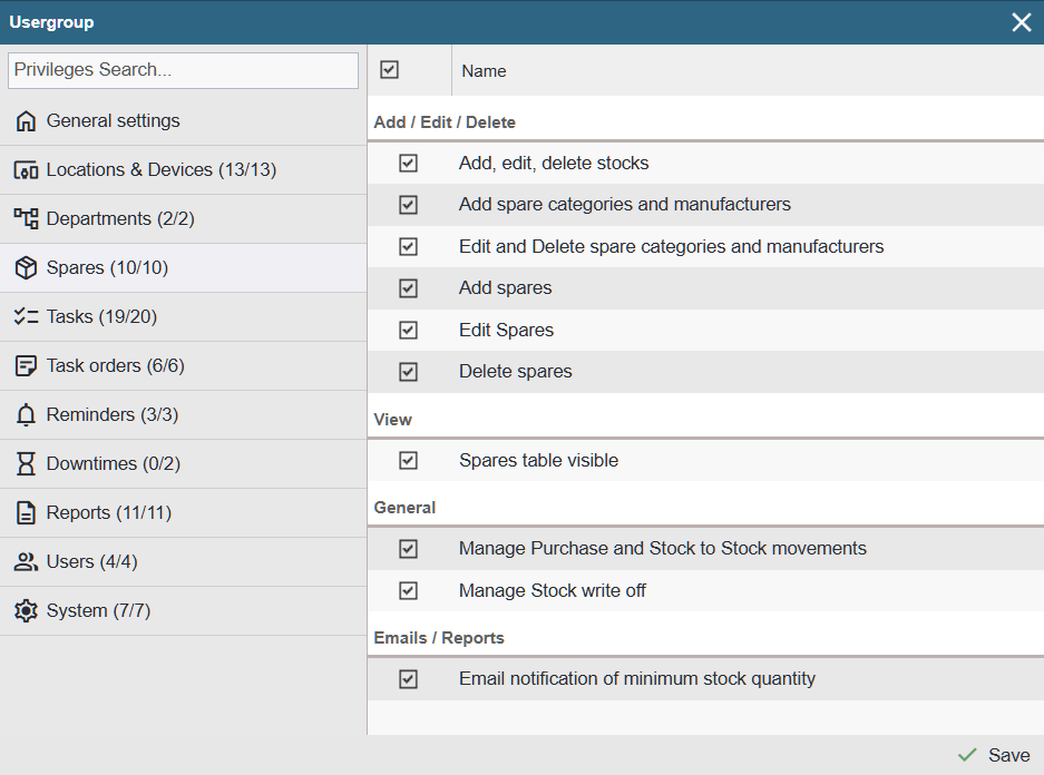 Add, edit, delet stocks – Provides access to the menu Settings > Spares > Stocks and allows managing the list of warehouses (add, edit, delete).