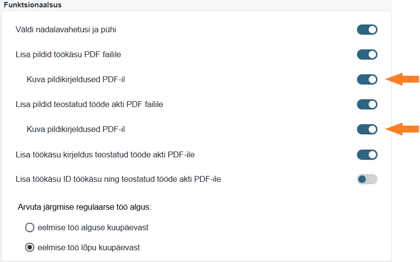 - [#657] Lisatud võimalus töökäsul ja/või teostatud tööde aktil kuvatud piltide juurde kuvada faili kirjeldus (faili nimetus). Funktsiooni aktiveerimiseks vaata Seadistused > Seadistused > Üldised seaded