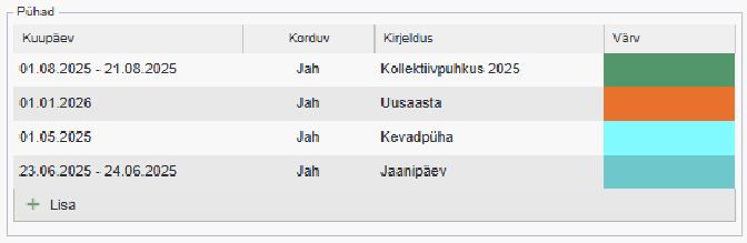 Pühade lisamiseks vajuta tabeli all vasakul paiknevale nupule “+ Lisa“