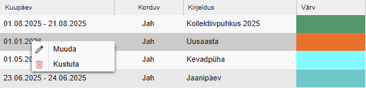 - Värv – Mis värviga antud püha/tähtpäeva kalendris kuvatakse