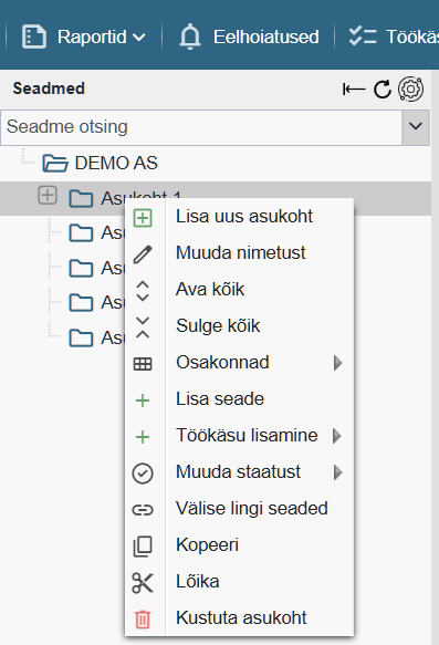 NB! Asukohta ei ole võimalik kustutada kui selles (või selle alamasukohtades) paiknevad seadmed. Selleks pead esmalt asukohast eemaldama kõik seadmed (kas kustutama või mujale liigutama) ning alles seejärel saad soovitud asukoha kustutada (koos alamasukohtadega).