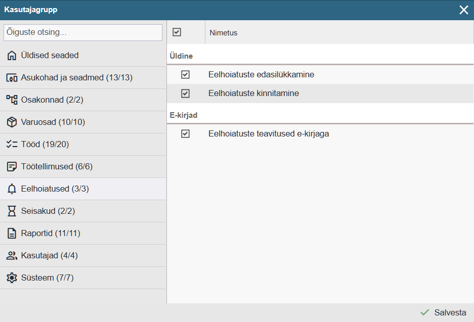 Eelhoiatuste kinnitamine – Võimaldab kasutajal kinnitada eelhoiatusi (märkida need lahendatuks). Kinnitatud eelhoiatused on eelduseks töökäsu täitmiseks ja kinnitamiseks.