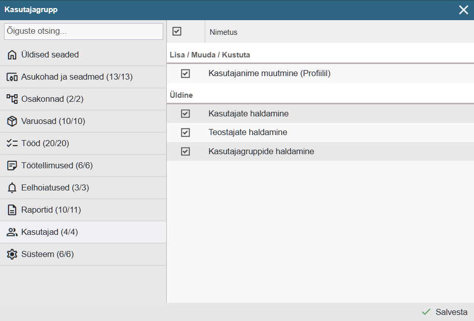 Kasutajagruppide haldamine – Võimaldab ligipääsu Seadistused > Kasutajad Grupid menüüle ning lisada, muuta, kustutada kasutajagruppe