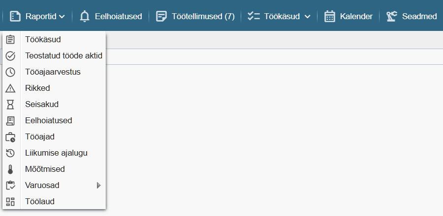 Töökäskude aruanded – Võimaldab ligipääsu menüüle “Raportid > Töökäsud”.