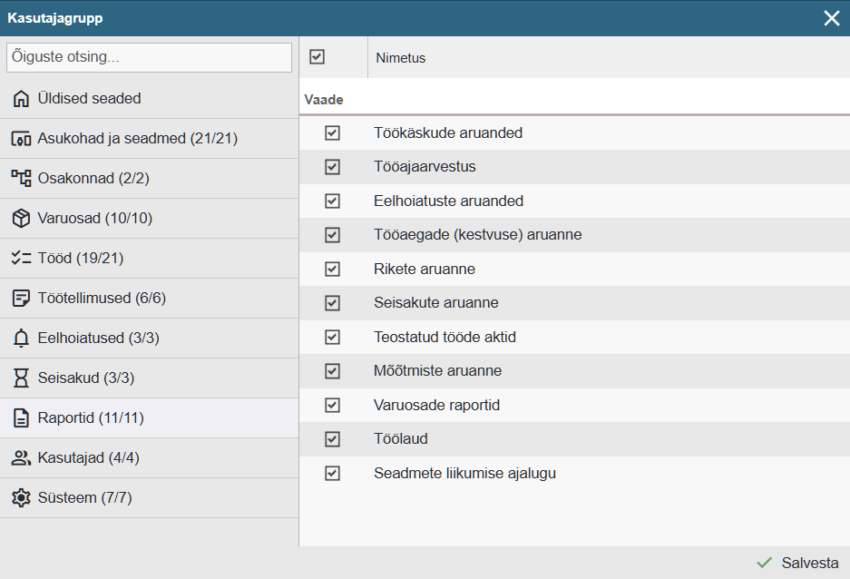 Tööajaarvestus – Võimaldab ligipääsu menüüle “Raportid > Tööajaarvestus”.