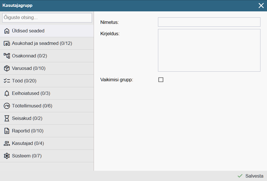 Nimetus: Kasutaja õiguste grupi nimetus (kohustuslik).