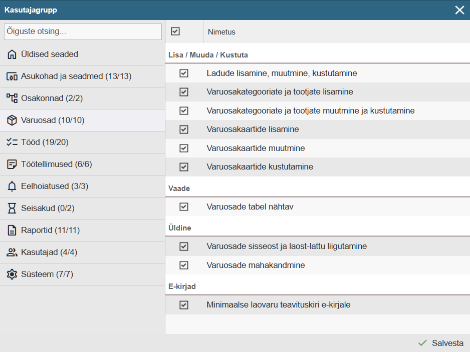Varuosakategooriate ja tootjate muutmine ja kustutamine – Võimaldab ligipääsu menüüdele Seadistused > Varuosad > Kategooriad ja Seadistused > Varuosad > Tootjad ning muuta ja kustutada kategooriaid ja tootjaid.