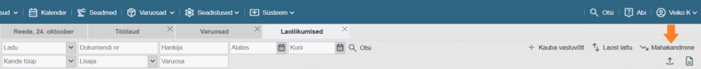 Mahakandmise teostamiseks vajuta üleval nupuribal nupule „Varuosad“ ning avanenud tabeli päises paremal paiknevale nupule „Laoliikumine“ …