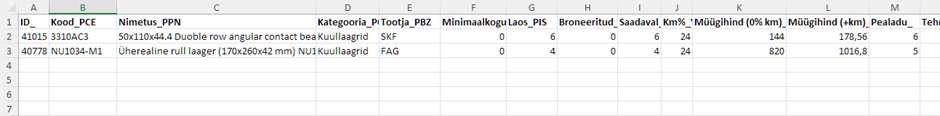 Eksporditud Exceli failis näete kõiki varuosa kaardiga seotud andmete tulpasid mille olete tabelis nähtavaks teinud.