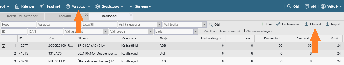 Varuosa andmete eksport faili hankimiseks kliki ülemisel menüüribal nupule “Varuosad”. Vajadusel seadista filtrid ning seejärel vajuta lehe paremal ülemises nurgas olevale nupule “Eksport”