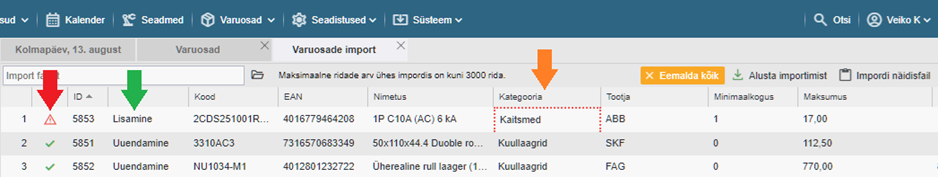Vigade parandamiseks kliki väljal ning tee muudatused või soorita valik (tootja nimetuse või kategooria puhul). Võite ka parandused teha lähte failis ning selle uuesti üles laadida, kuid siis ärge unustage eelnevalt vajutada nupule “Eemalda kõik”.