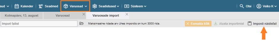Selleks kliki ülemiselt menüüribal nupule “Varuosad”, avanenud lehe paremas nurgas vali “Import” ning sealt omakorda “Impordi näidisfail”