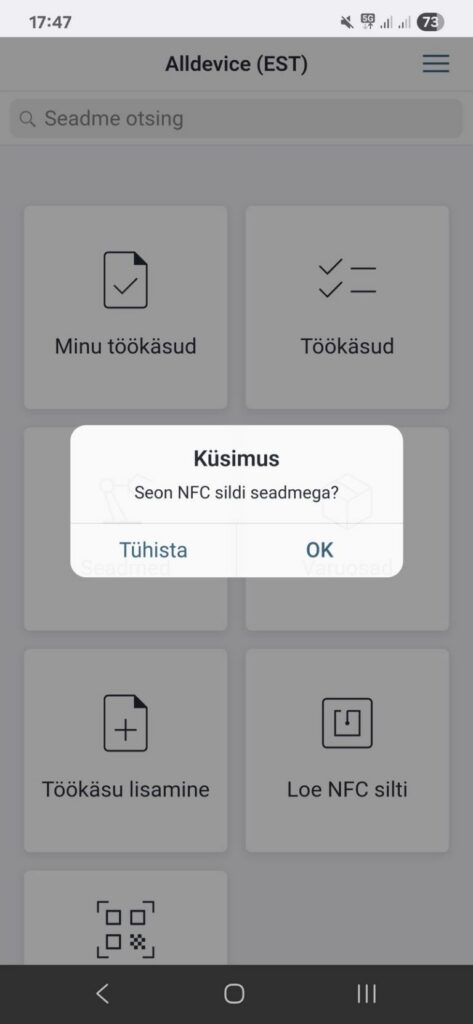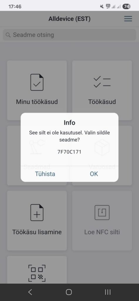 Kui sildi lugemine õnnestus, avab äpp sildiga seotud seadme vahemenüü või ütleb, et antud silt pole kasutusel ja kas soovid sellele seadme valida? Vajuta “Ok”