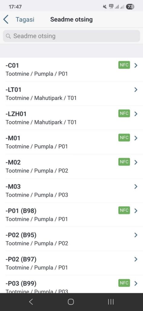 Nüüd avaneb seadme otsingu aken. Seal on ka juba näha seadmed mis on NFC sildiga seotud. Kui valid mõne nendest, siis asendatakse seadmel vana silt uuega.
