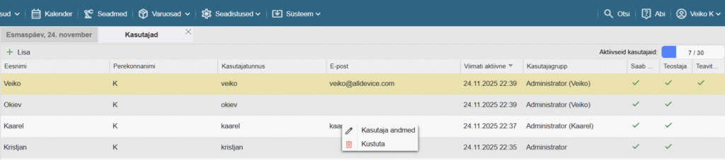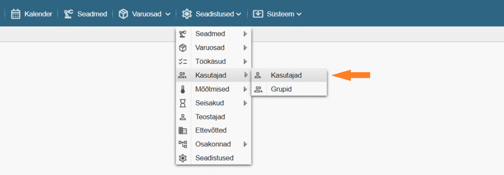 PS! Kui te ei näe Alldevice CMMS rakenduses viidatud menüülinke, puudub teil kasutajate haldamiseks vastav õigus (privileeg).