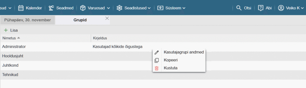 Olemasoleva kasutaja grupi kloonimiseks vali “Kopeeri”. See on hea võimalus teha uus grupp lähtuvalt mõnest olemasolevast grupist.
