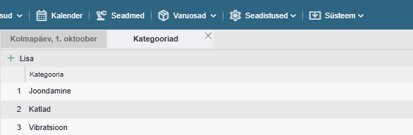 Kategooria lisamiseks vajuta nupule „+ Lisa“ ning sisesta soovitud nimetus.