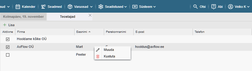 Teostaja muutmiseks või kustutamiseks tee soovitud real hiirega paremklikk ning avanenud kontekstimenüüst soorita soovitud valik.